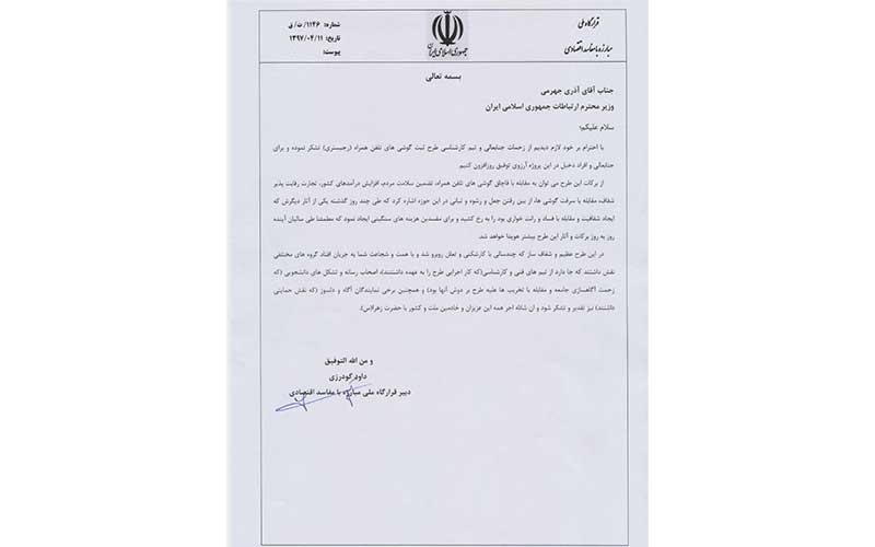 متن نامه قرارگاه ملی مبارزه با مفاسد اقتصادی خطاب به وزیر ارتباطات به شرح ذیل است؛