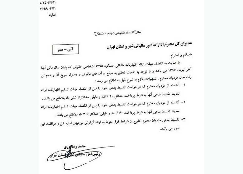 در این بخشنامه آمده است، با عنایت به تحقق به موقع درآمدهای مالیاتی، وصول سریع آن و همچنین رفاه حال مودیان تسهیلات لازم در اختیار آنها قرار خواهد گرفت.