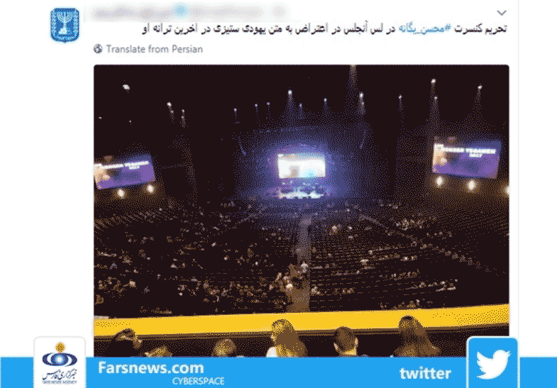 اکانت رسمی توئیتری یکی از اسرائیلیها که به زبان فارسی اداره میشود به دلیل آن چه آهنگ ضدصهیونیستی خوانده سعی کرده تا کنسرت وی را تحریم کند.