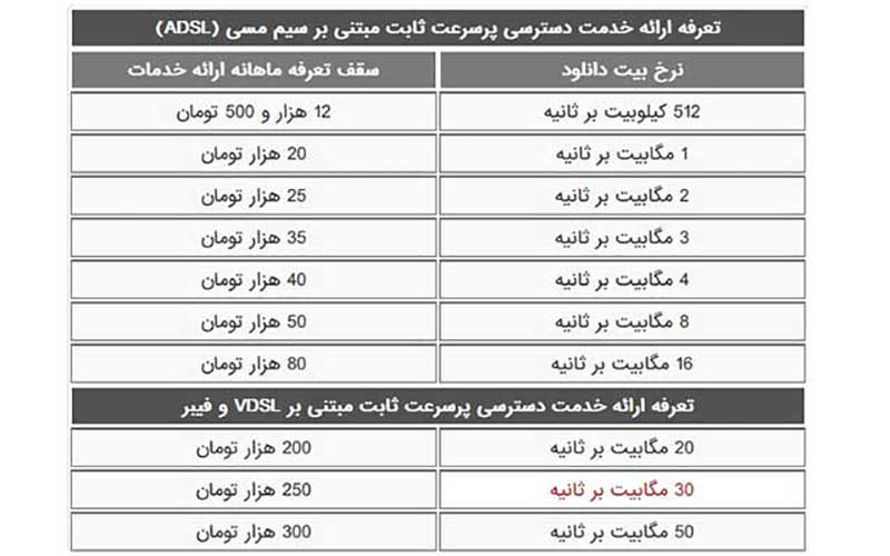 تغییر روش فروش اینترنت از حالت حجمی به غیر حجمی از مدت‌ها پیش در دستور کار دولت قرار گرفته بود اما هر بار، کاربران به مدل جدید و تعرفه‌های جدید اینترنت ارائه شده اعتراض می‌کردند و همین موضوع باعث شد تا ارائه خدمات اینترنت پرسرعت غیر حجمی به تعویق بیفتد. سرانجام چند روز پیش، تعرفه جدید اینترنت توسط مسئولان وزارت ارتباطات و کمیسیون تنظیم مقررات ارتباطات اعلام شد که در جدول زیر می‌توانید آن را مشاهده کنید: