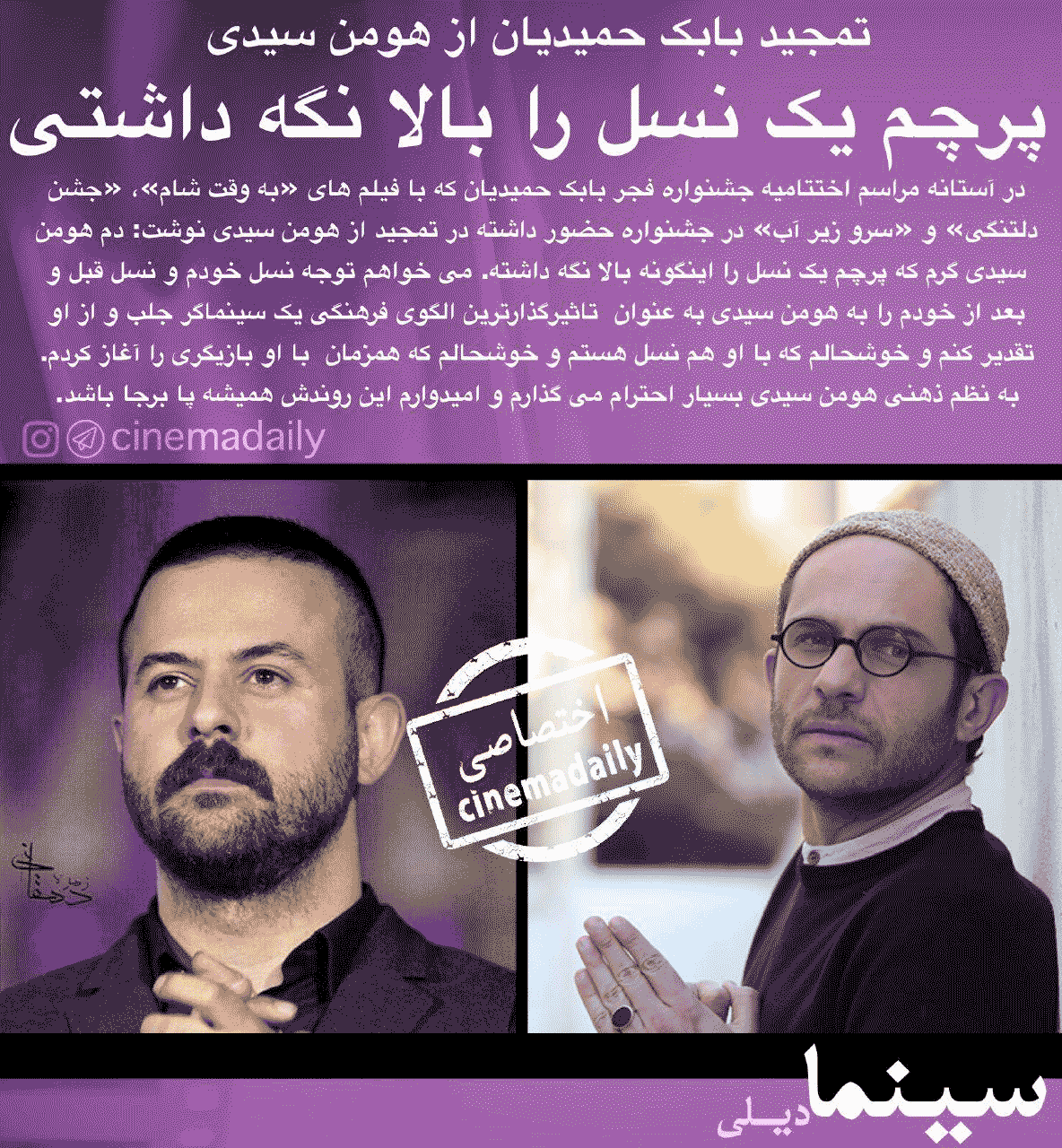 بابک حمیدیان با انتشار یادداشتی که در اختیار «سینما» قرار داده نوشت: با حفظ احترام به تمام کاندیدا‌های جشنواره امسال می‌خواهم نظر خودم را درباره یک اسم بگویم که به نظرم این اسم مهم ترین، تاثیرگذارترین و باهوش‌ترین الگوی یک نسل است و آن هومن سیدی است. هومن سیدی با این حجم از شهرت که در این سال‌ها به خوبی و با مهارت کسب کرده، نماد و الگوی خوبی برای رشد یک سینماگر محسوب می‌شود. هومن سیدی علاوه بر فعالیت در عرصه بازیگری و کارگردانی، نسل درخشانی از بازیگران را به سینمای ایران معرفی کرده است و الزاما این معرفی به معنی آن نیست که آیا نوید محمدزاده وامیر جدیدی اولین بار با هومن سیدی کار کرده اند یا خیر. منظور این است که رشد حرفه‌ای و نزدیک شدن آرام آرام به کمال بازیگری را هر دوی این ستاره‌ها در کار‌های هومن سیدی داشته اند. دو بازیگری که تماشا کردن بازی شان برای من لذت بخش است و امیدوارم نسلی که بازیگری را دنبال می‌کند، نوع رفتار این دو بازیگر درخشان را برای رسیدن به بالاترین سطح بازیگری الگو قرار دهد.