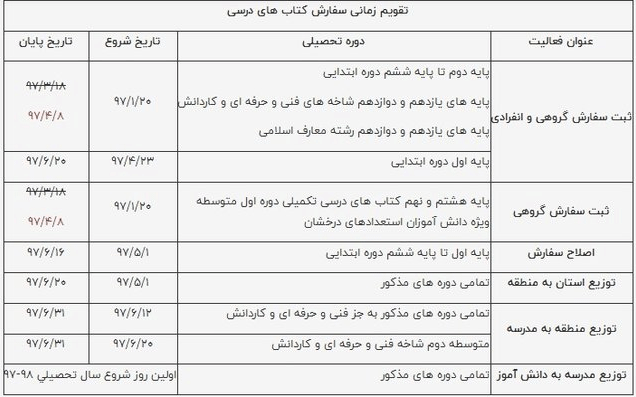 به توصیه سازمان پژوهش و برنامه ریزی آموزشی، لازم است مدارس ضمن اطلاع رسانی به دانش‌آموزان به شرح جدول تقویم زمانی مذکور، نسبت به ثبت سفارش کتاب‌های درسی سال تحصیلی ۹۸-۹۷ با فرض قبولی دانش آموز در سال تحصیلی جاری اقدام کنند. در صورت عدم موفقیت دانش آموز در پایه فعلی، در زمان اصلاح سفارش امکان تغییر پایه وجود خواهد داشت.