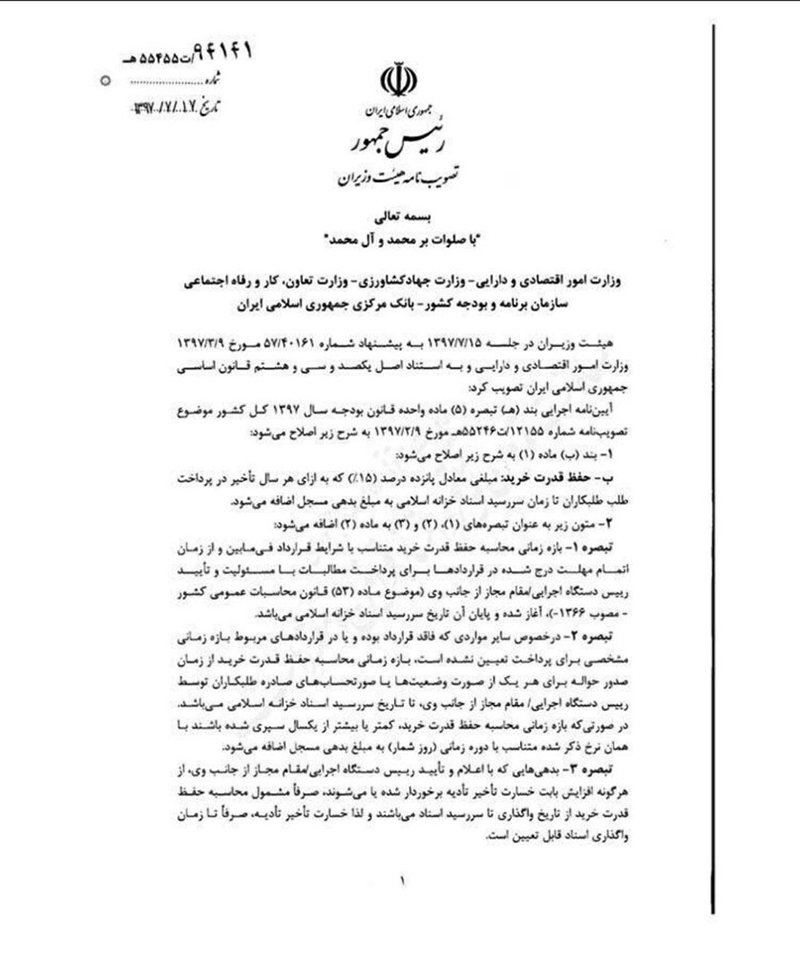 همچنین دستگاههای اجرایی میتوانند بابت کسور بیمه تامین اجتماعی با محاسبه حفظ قدرت خرید، نسبت به واگذاری اسناد خزانه اسلامی با عنوان سازمان تامین اجتماعی اقدام نمایند. سازمان تامین اجتماعی نیز در مقابل مکلف است در قبال اسناد خزانه اسلامی واگذار شده بابت مطالبات آن سازمان در اسرع وقت نسبت به صدور مفاصا حساب بدون محاسبه جریمه اقدام نمایند.