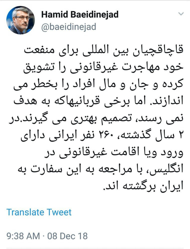 حمید بعیدینژاد در توییتی نوشت: قاچاقچیان بینالمللی برای منفعت خود مهاجرت غیرقانونی را تشویق کرده و جان و مال افراد را به خطر میاندازند. اما برخی قربانیها که به هدف نمیرسند، تصمیم بهتری میگیرند. در دو سال گذشته، ۲۶۰ نفر ایرانی که اقامت غیرقانونی در انگلیس داشتند، با مراجعه به سفارت ایران در لندن به ایران برگشتهاند.