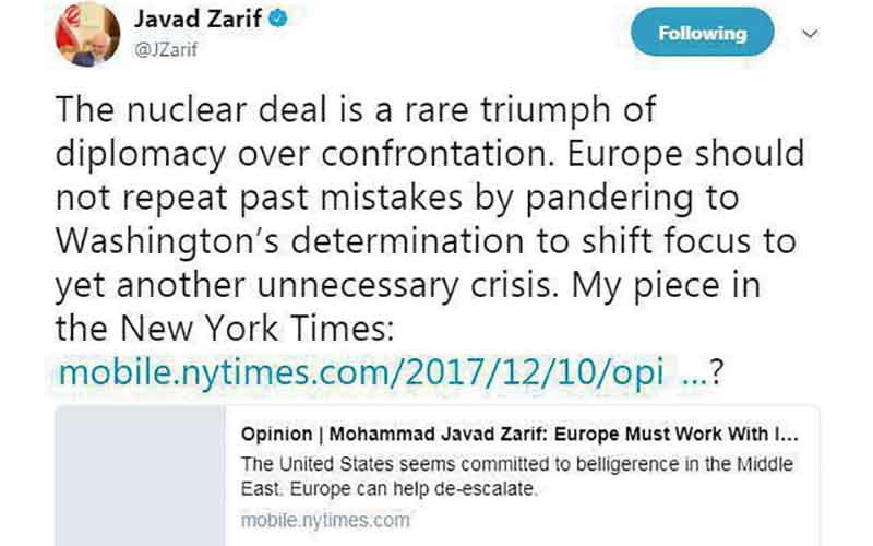 توئیت جدید ظریف: اروپا اشتباه گذشته را تکرار نکند