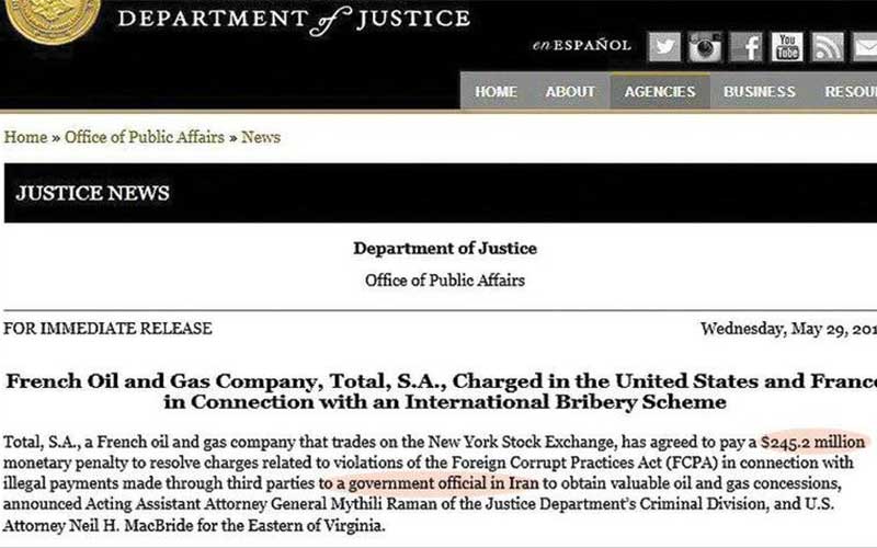 در سند رسمی وزارت دادگستری آمریکا آمده است شرکت نفتی توتال به جرم رشوه دادن به یک مقام رسمی دولت اسبق ایران (در دولت اصلاحات)، محکوم به پرداخت بیش از ۲۴۵ میلیون دلار جریمه شده است.
