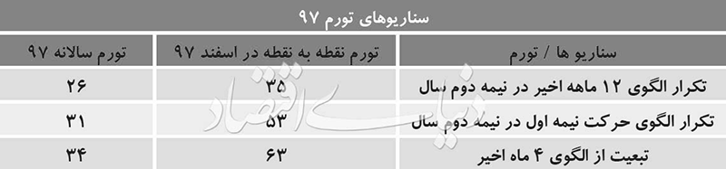 تکرار الگوی نیمسال اول: طی سناریوی دیگری میتوان تصور کرد شاخص قیمت در ۶ ماه دوم سال جاری از الگوی نیمسال ابتدایی سال پیروی میکند. میانگین رشد ماهانه شاخص قیمت در ۶ ماه ابتدایی سال جاری حدود ۶/ ۳ درصد بوده است. اگر این الگو در نیمسال دوم نیز تکرار شود در نهایت شاخص قیمت در اسفندماه به عدد ۴/ ۱۷۵ خواهد رسید. تحت چنین شرایطی تورم نقطه به نقطه در اسفندماه به ۵۳ درصد و تورم سالانه به ۳۱ درصد خواهد رسید. تکرار الگوی ۴ ماهه: طی سناریوی دیگری میتوان فرض کرد شاخص قیمت در ۶ ماه دوم سال از الگوی ۴ ماه اخیر پیروی میکند. میانگین تورم ماهانه در ۴ ماه منتهی به شهریور ۷/ ۴ درصد بوده است. اگر این الگو برای ماههای باقیمانده سال نیز تکرار شود، در پایان سال شاخص قیمت به ۱۸۷ واحد خواهد رسید. تحت چنین سناریویی، در اسفندماه تورم نقطه به نقطه به ۶۳ درصد و تورم سالانه به حدود ۳۴ درصد خواهد رسید.