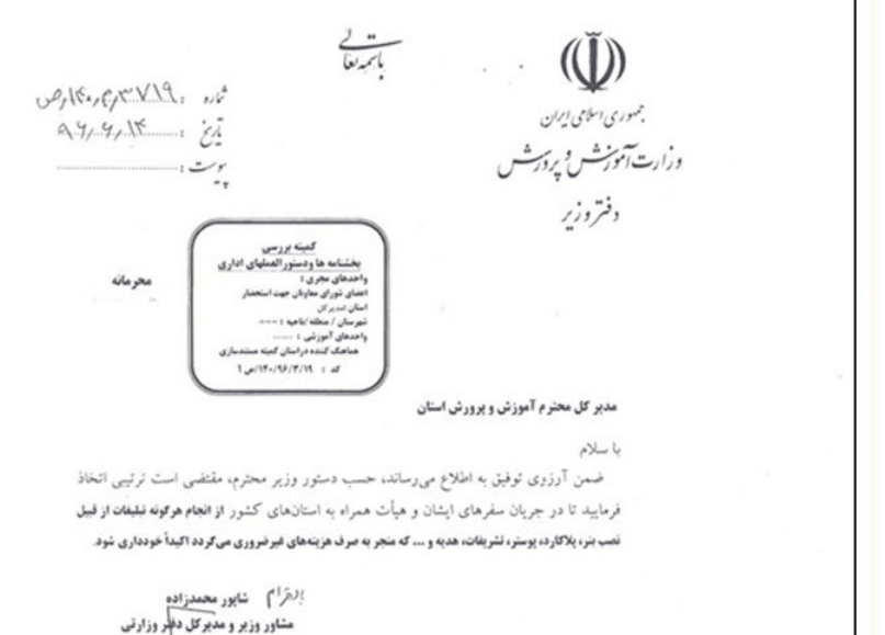 این بخشنامه از طرف «شاپور محمد زاده» مدیرکل دفتر وزارتی در تاریخ ۱۴شهریور۹۶ صادر شده بود که متن کامل و تصویر این بخشنامه در پی میآید: