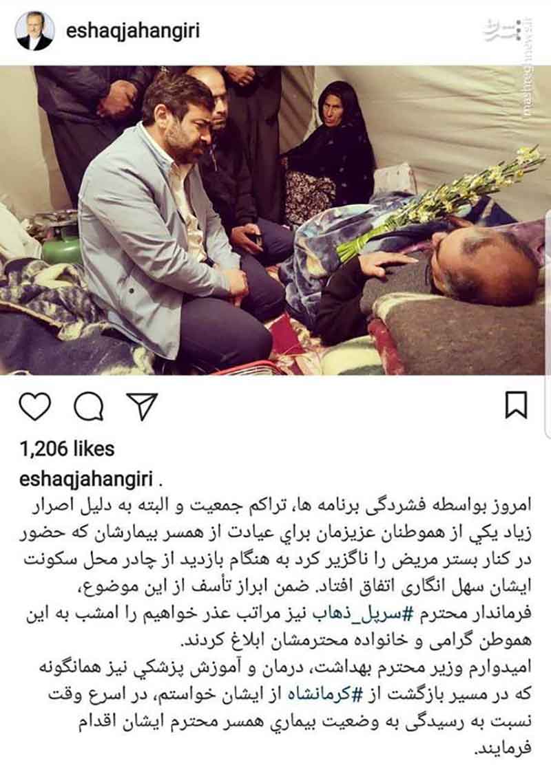 اسحاق جهانگیری پس از اعتراضات بسیار به تصاویر منتشر شده از ورود با کفش وی و همراهانش به چادرهای زلزله زدگان، در پستی اینستاگرامی نوشت: