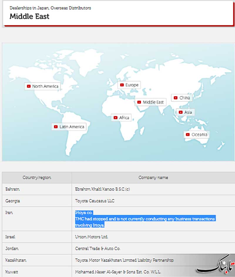 نکته مهم در این بین این است، همان گونه که گفته شد تویوتا مدت هست در ایران نمایندگی فعالی ندارد و این را در سایت رسمی خود نیز اعلام نموده است. همان گونه که از تصویر زیر مشخص است، رو به روی اسم ایران، ذکر شده است که “تویوتا موتور کمپانی (TMC) فعالیتش متوقف شده و در حال حاضر هیچگونه معاملات تجاری با «ایرتویا» ندارد”.