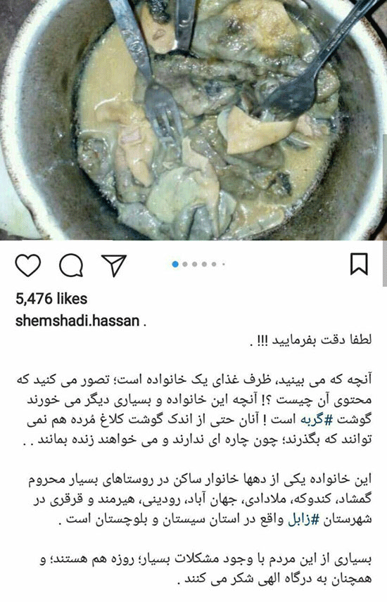 عکس منتشر شده توسط حسن شمشادی خبرنگار صداوسیما و ادعای خوردن گوشت گربه در سیستان وبلوچستان