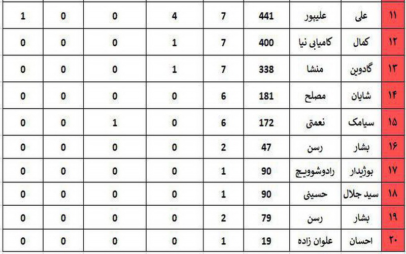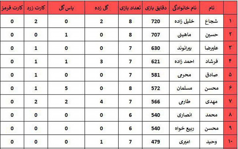 جدول عملکرد فردی بازیکنان پرسپولیس