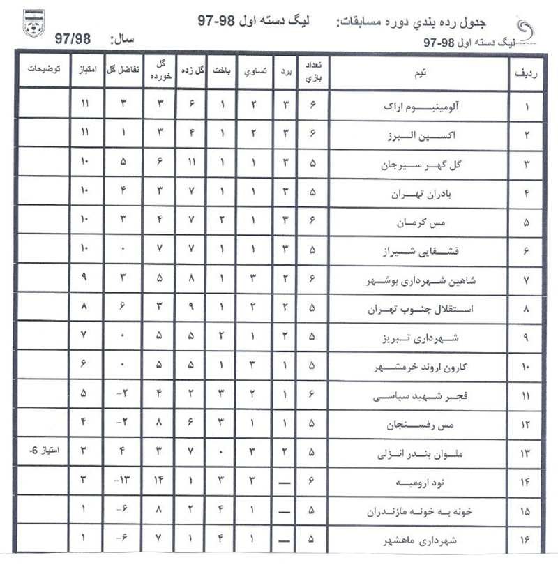 به گزارش بازتاب و به نقل از سایت فدراسیون فوتبال، کمیته مسابقات سازمان لیگ جدول مسابقات لیگ دسته اول فوتبال در فصل ۹۸-۹۷ تا ‌پایان هفته ششم را منتشر کرد. در این جدول تیم سیاه جامگان از جدول لیگ کنار گذاشته شده است. پیش از این نیز تیم نفت تهران ‌از لیگ دسته اول کنار گذاشته شده بود. ‌