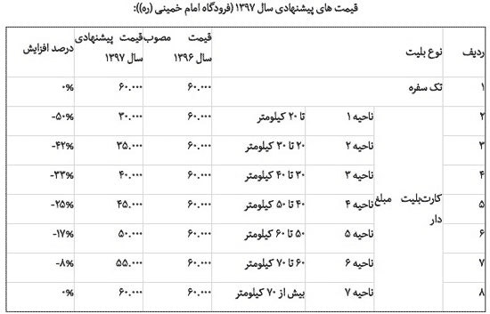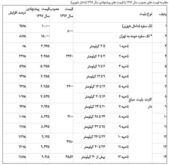 همچنین پیشنهاد شهرداری برای بلیت تک سفره حومه به تهران که در سال ۹۶، ۸۰۰ تومان بود، ۱۵۰۰ تومان است.