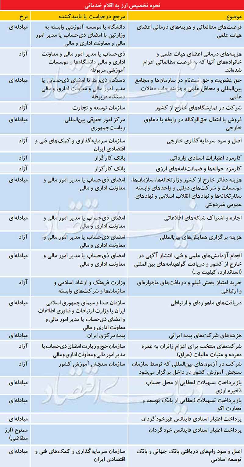 بانک مرکزی در گام بعدی حرکت به سمت یکسانسازی تدریجی نرخ ارز، هشت مورد از اقلام خدماتی را از سبد کالاهای مشمول دریافت ارز مبادلهای حذف کرد. بر مبنای جدیدترین بخشنامه ارزی بانک مرکزی از این پس هزینه درمان خانواده اعضای هیات علمی در فرصت مطالعاتی، هزینه شرکت در نمایشگاههای خارج از کشور، کارمزد اعتبارات اسنادی، حواله و ضمانتنامه ارزی، اصل و سود سرمایهگذاری خارجی، ارز زیارتی، حق خرید فیلم و هزینه مربوط به فروش و انتقال حقالوکاله در دعاوی خارجی از چتر ارز مبادلهای خارج خواهد بود.