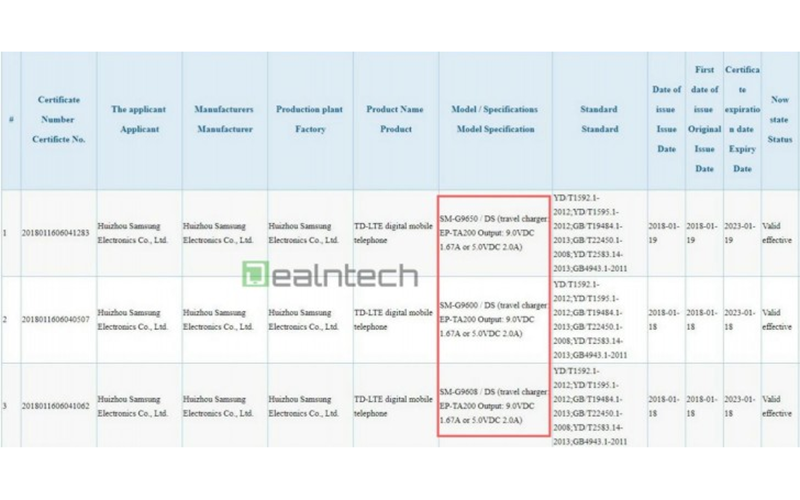 اسناد منتشرشده، جزئیات جدیدی از منبع تغذیهی گوشیهای گلکسی اس ۹ و گلکسی اس ۹ پلاس به تصویر میکشند. آژانس ملی مخابرات برزیل پیشتر اعلام کرده بود که ظرفیت باتری پرچمداران جدید سامسونگ تغییری نخواهد کرد و اکنون اسناد مربوط به گواهی اجباری چین (3C)، اطلاعاتی در رابطه با پشتیبانی این محصولات از فناوری شارژ سریع نیز در اختیارمان میگذارند.
