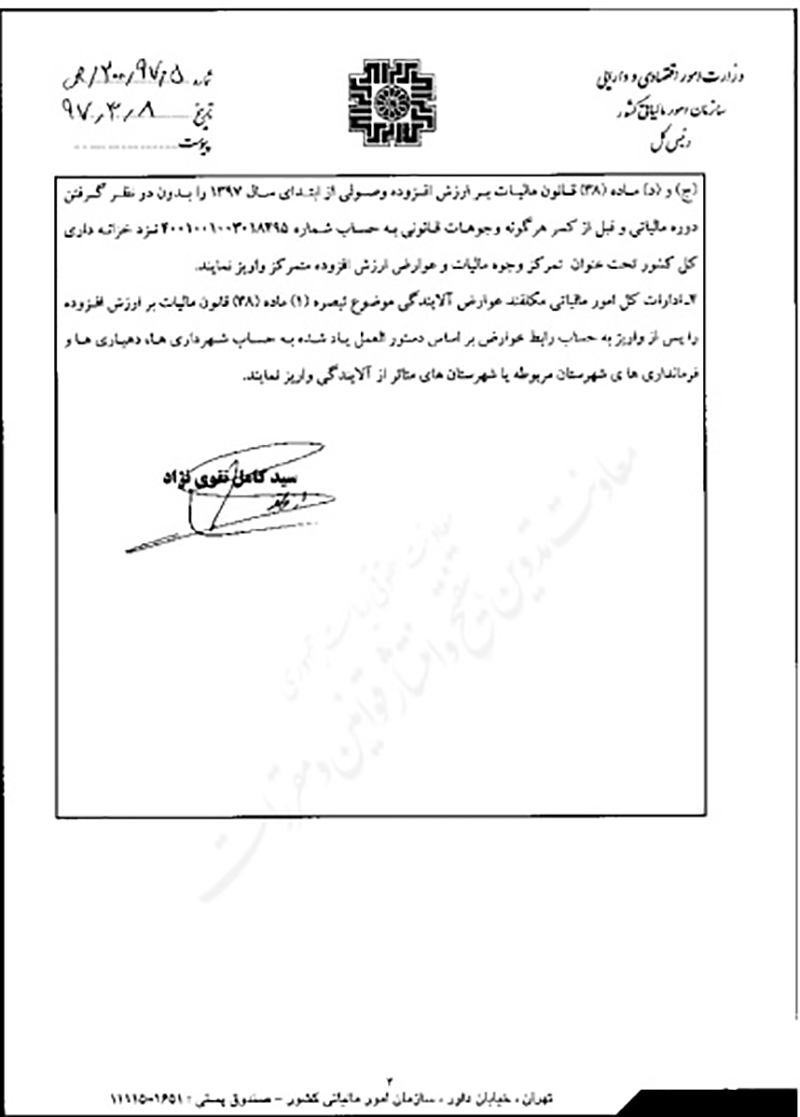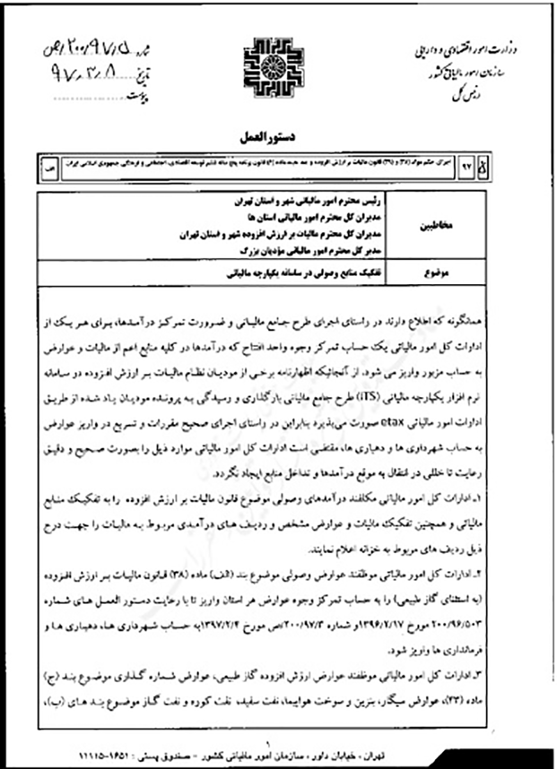 در بخشی از این ابلاغیه آمده است: ادارات کل امور مالیاتی مکلفند درآمدهای وصولی موضوع قانون مالیات بر ارزش افزوده را به تفکیک منابع مالیاتی و همچنین تفکیک مالیات و عوارض مشخص و ردیفهای درآمدی مربوط به مالیات را جهت درج ذیل ردیفهای مربوط به خزانه اعلام نمایند.