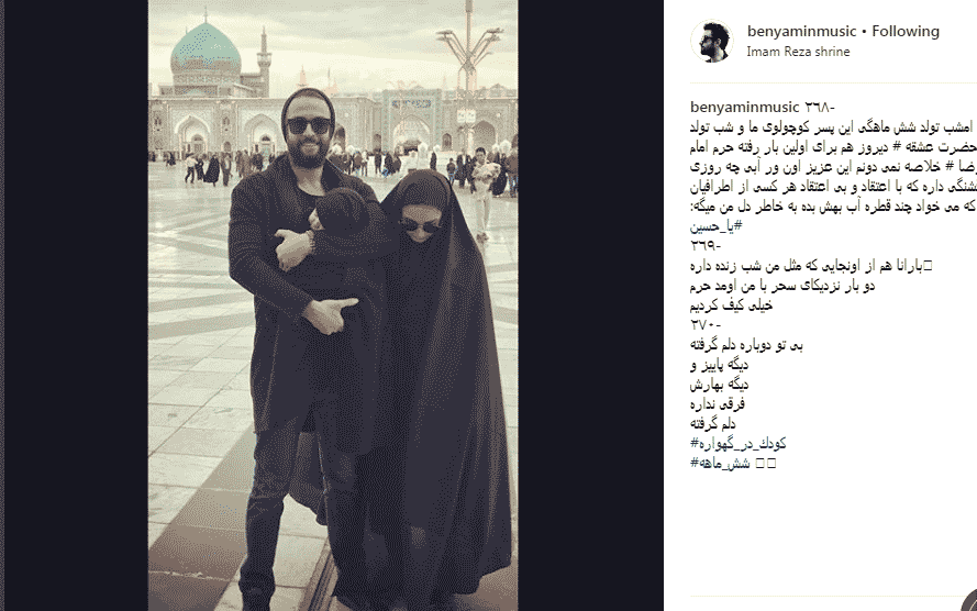 بنیامین به تازگی در صفحه اینستاگرامش تصویری از خود کنار همسر و فرزند پسرش در بارگاه ملکوتی امام رضا (ع) را منتشر و عنوان کرد که شب تولدشش ماهگی پسرش بنسان است.