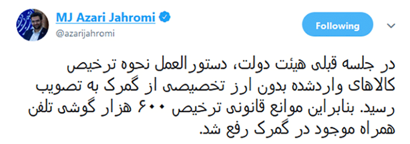آذری جهرمی، وزیر ارتباطات درباره گوشی های مانده در گمرک و قانون ترخیص آنها در توئیتر نوشت: «در جلسه قبلی هیئت دولت، دستورالعمل نحوه ترخیص کالاهای واردشده بدون ارز تخصیصی از گمرک به تصویب رسید. بنابراین موانع قانونی ترخیص ۶۰۰ هزار گوشی تلفن همراه موجود در گمرک رفع شد.»