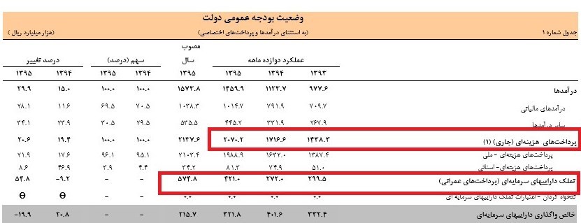 به گزارش خبرنگاران پویا، بر اساس گزارش بانک مرکزی میزان هزینه‌های جاری دولت در سال۹۵ ، ۲۰۷ هزار میلیارد تومان و میزان اعتبارات عمرانی در کل سال گذشته حدود ۴۲ هزار میلیارد تومان بوده است.