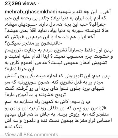 مهراب قاسم‌خانی با اننشار پستی در صفحه اینستاگرامش به صحبت‌های وحید یامین‌پور واکنش نشان داد اما اینستاگرام این پست او را حذف کرد.