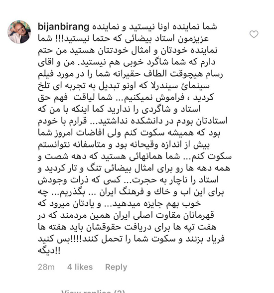 بیژن بیرنگ بعد از صحبتهای ابراهیم حاتمی کیا در اینستاگرام خود نوشت: