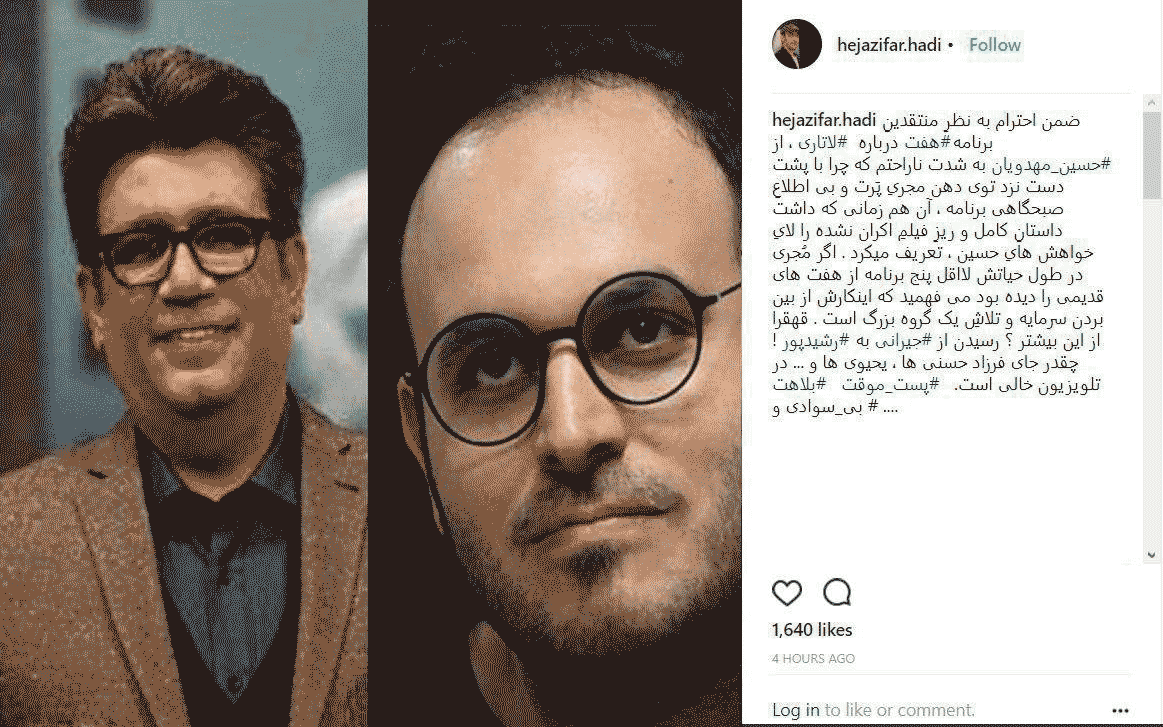 هادی حجازی فر نوشته است: ازمهدویان به شدت ناراحتم که چرا باپشت دست نزد توی دهن مجری پرت و بی اطلاع صبحگاهی تلویزیون!