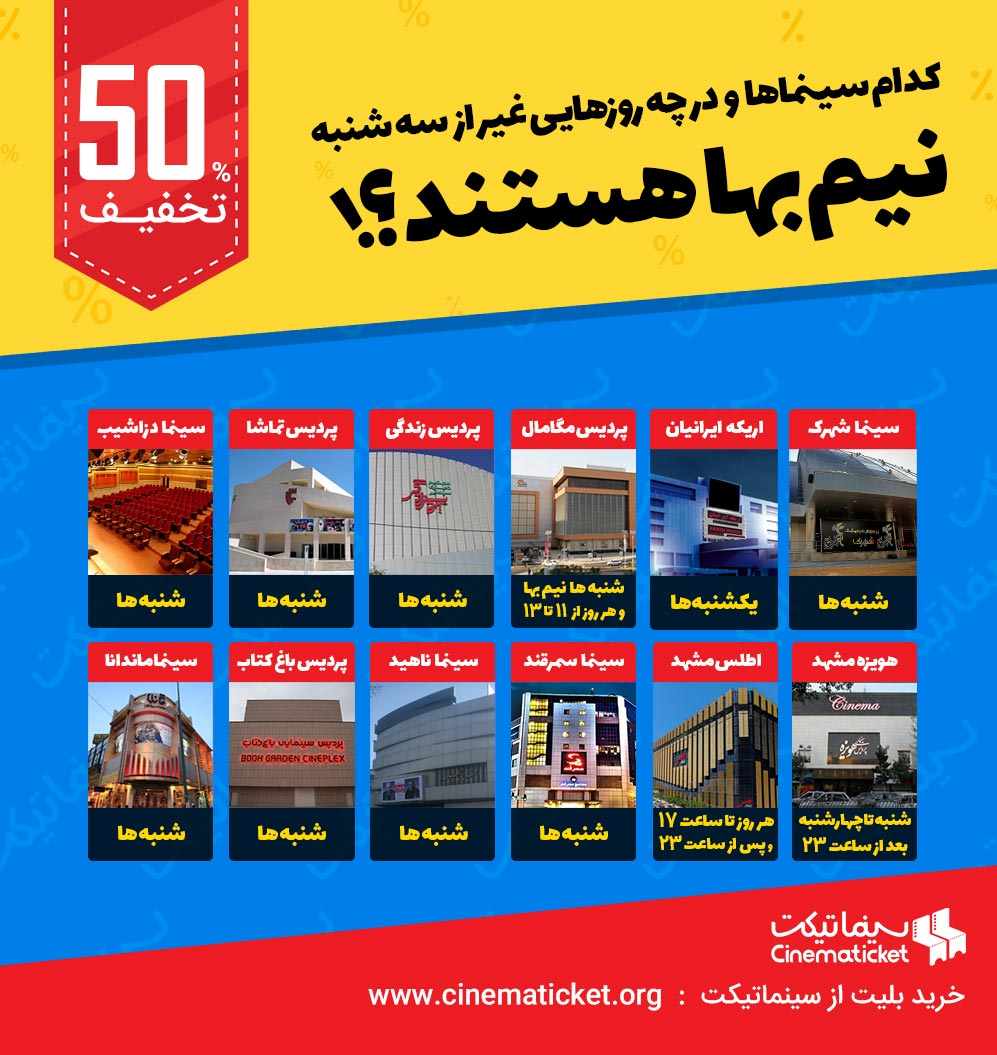 این در حالی است که بسیاری از سینماها در سال جاری به موازات افزایش نرخ بلیتها، تعداد سانسهای نیمبهای خود را افزایش دادهاند و روزهای شنبه را هم نیمبها اعلام کردهاند که از جمله آنها میتوان به پردیسها و سالنهای سینمایی مگامال، زندگی، تماشا، باغ کتاب، شهرک، ناهید، ماندانا و اریکه ایرانیان اشاره کرد. (+)