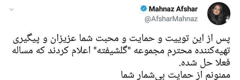 «پس از توئیت و محبت و حمایت شما عزیزان و تهیهکننده محترم مجموعه «گلشیفته» اعلام کردند مساله فعلا حل شده.