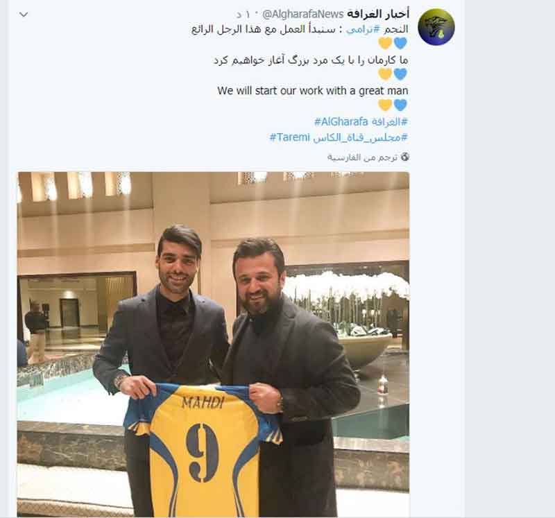 توئیتر اخبار باشگاه الغرافه قطر لحظاتی پیش جمله تمجیدی مهدی طارمی، مهاجم جدید این درباره بولنت، سرمربی ترکیهای تیم را به ۳ زبان عربی، فارسی و انگلیسی منتشر کرد.