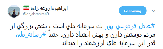 ابراهیم داروغه زاده، رئیش جشنواره سینمایی فجر در توییتی از فردوسی پور حمایت کرد. او نوشت: «عادل فردوسی پور یک سرمایه ملی است، بخش بزرگی از مردم دوستش دارن و بهش اعتماد دارن. حتماً رسانه ملی قدر این سرمایههای ارزشمند را میداند»