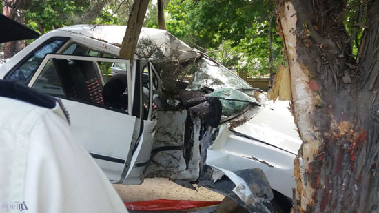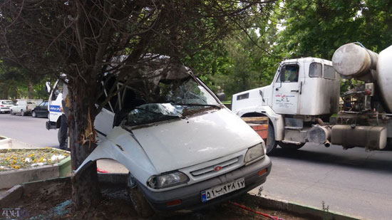 ضعف ایمنی پراید و نبود فرهنگ رانندگی، منجر به مچاله شدن بخش جلویی پراید در برخورد با درخت شد.