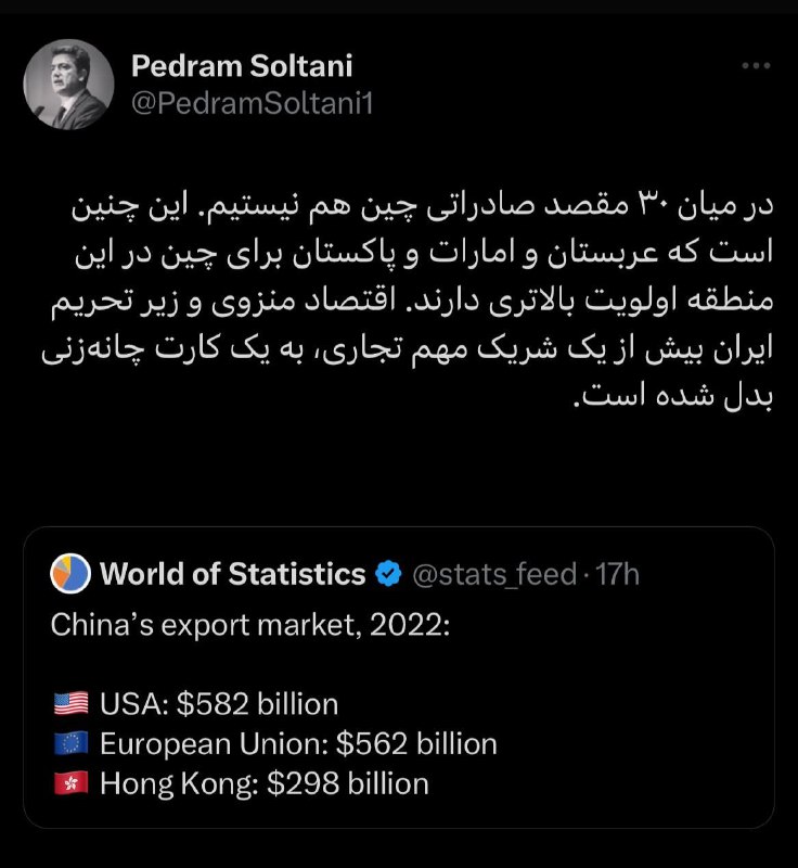 در میان ۳۰ مقصد صادراتی چین هم نیستیم. این چنین است که عربستان و امارات و پاکستان برای چین در این منطقه اولویت بالاتری دارند.