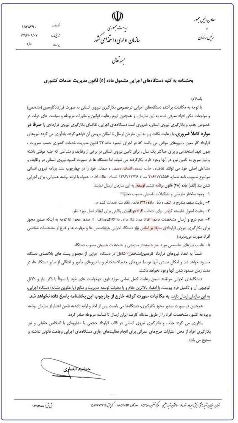 با بخشنامه سازمان اداری و استخدامی، به کارگیری نیروهای با قرارداد کارمعین در ادارات دولتی منوط به موارد کاملا ضروری شد.