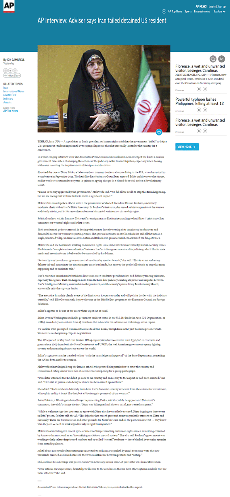 «نزار زکا» همان جاسوسی است که شهریور ۹۴ به دعوت همین خانم مولاوردی که در آن زمان معاون زنان و خانواده رئیسجمهور بود، در پوشش کارشناس فناوری اطلاعات وارد ایران شد تا ماموریت ویژه خود که از جانب آمریکاییها به وی تفویض شده بود را در کشور ما، پیش ببرد.