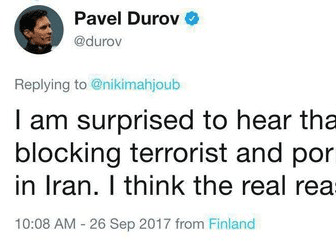 در واکنش به این اظهارات، پاول دورف – مدیرعامل تلگرام – که معمولا در پاسخ به توییت دنبالکنندگان خود در شبکه اجتماعی توییتر، به اظهارات اینچنینی واکنش نشان میدهد، نوشت: از شنیدن این موضوع تعجب میکنم. ما به طور فعال محتوای تروریستی و پورنوگرافی را در ایران مسدود میکنیم. فکر میکنم دلایل اصلی، متفاوت از این موضوعات باشد.