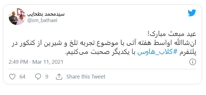 اینکه فردی چون آقای بطحایی بر اساس کدام استدلال از میان همه شبکه های اجتماعی داخلی و خارجی دیگر این بار کلاب هاوس را برای ارتباط با مخاطبان خود آن هم نوجوانان و جوانان انتخاب کرده است، پرسش مهمی است که امکان پاسخ به آن در این نوشته فراهم نیست.