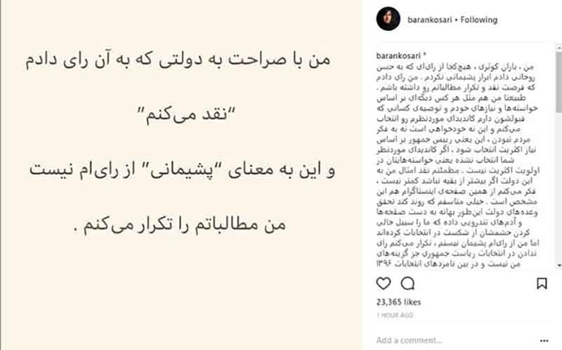 مطمئنم نقد امثال من به این دولت اگر بیشتر از بقیه نباشد کمتر نیست، فکر میکنم از همین صفحه اینستاگرام هم این مشخص است. خیلی متاسفم که روند کند تحقق وعدههای دولت اینطور بهانه به دست صفحهها و آدمهای تندرویی داده که ما را سیبل خالی کردن خشمشان از شکست در انتخابات کردهاند اما من از رایام پشیمان نیستم، تکرار میکنم رای ندادن در انتخابات ریاست جمهوری جز گزینههای من نیست و در بین نامزدهای انتخابات ۱۳۹۶ حسن روحانی همچنان انتخاب من و نقد دولتی که به آن رای دادم حق طبیعی من است.»