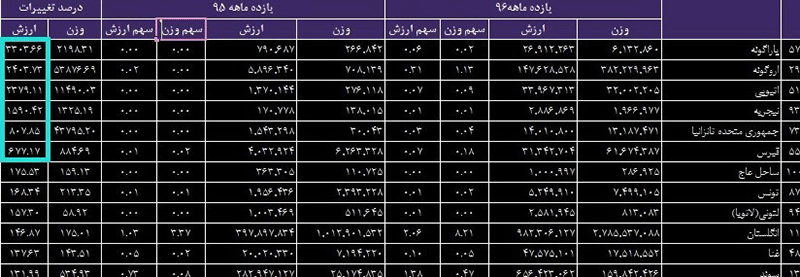 به عنوان مثال در صدر فهرست کشورهایی که بیشترین افزایش واردات به ایران را داشتهاند، اتیوپی قرار گرفته است که نسبت به مدت مشابه سال قبل ۲۳۸۰ درصد افزایش واردات داشته است. در این مدت افزایش واردات از نیجریه، ۱۵۹۰ درصد و همچنین واردات از تانزانیا ۸۰۰ درصد افزایش یافته است. واردات از ساحل عاج و تونس نیز نزدیک به ۱۷۰ درصد افزایش یافته است.