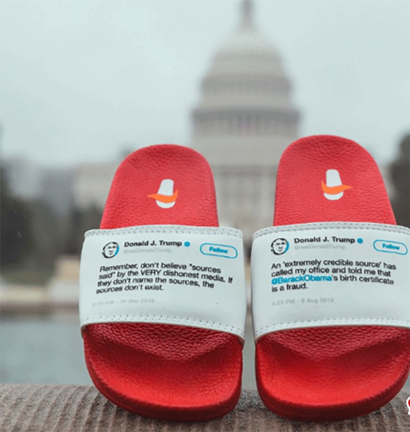 به گزارش انتخاب، یک هنرمند و عکاس جوان و ۲۷ ساله در لس آنجلس، از طریق وبسایت خود اقدام به فروش دمپایی هایی می کند که منقش به توییت های دونالد ترامپ است. توییت هایی که اکثرا جنجالی و گاهی بی محتوا هستند. این جوان خلاق موفق شده کل دست ساخته های خود را در یک ماه بفروشد و می گوید اهداف بلند مدتی برای توییت های رئیس جمهور دارد.
