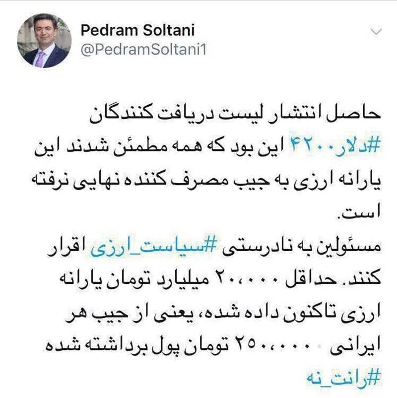 به گزارش مهر، پدرام سلطانی در توئیتی با عنوان «رانت_نه» نوشت:« حاصل انتشار لیست دریافت کنندگان دلار ۴۲۰۰ تومانی این بود که همه مطمئن شدند این یارانه ارزی به جیب مصرف کننده نهایی نرفته است.