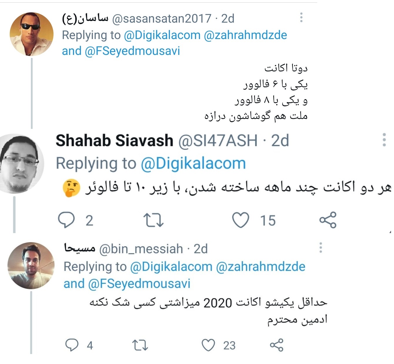 البته جدا از تعداد کم برندگان (تنها دو نفر) ابهام های زیادی نیز در مورد این دو برنده و کیستی آنها و نیز فرایند این قرعه کشی جذاب وجود دارد؛ ابهام هایی که برای تأیید آنها کافیست به سال و ماه عضویت هر دو کاربر برنده در توئیتر و تعداد دنبال کننده و دنبال شده هایشان دقت کنیم تا دریابیم که این روند قرعه کشی چندان هم خالی از ابهام نبوده است؛ موضوع مهمی که از دید بسیاری از کاربران توئیتری هم دور نماند و به آن اشاره کرده اند.