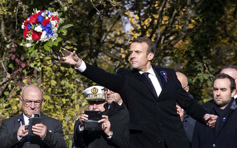 امانوئل مکرون رئیس جمهور فرانسه در حال پرتاب کردن دسته گل