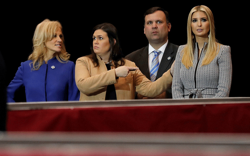 سارا سندرز در حال نشان دادن ایوانکا ترامپ دختر رئیس جمهور آمریکا