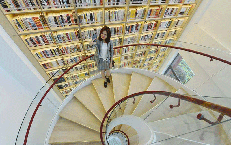 عکس سلفی روی پله های مارپیچ یک کتابخانه در ژجیانگ چین