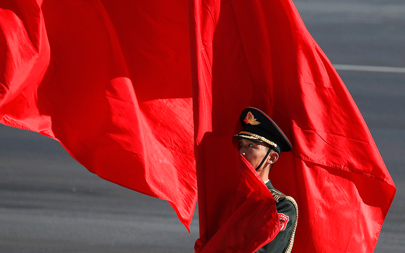 یک نظامی گارد تشریفات چین در مراسم استقبال از شینزو آبه