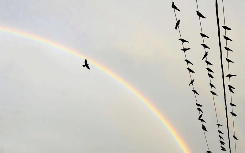 پرندگان روی سیم های برق هنگام ایجاد رنگین کمان در کلمبو