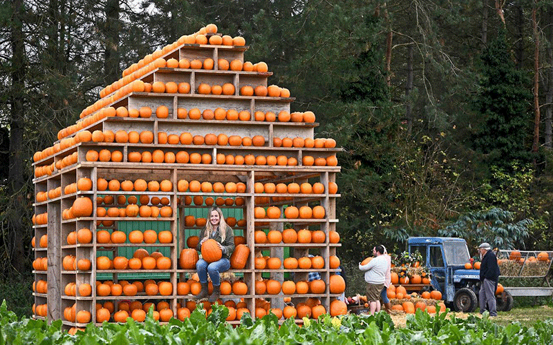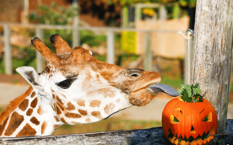 یک زرافه در حال خوردن کدو تنبل در لندن