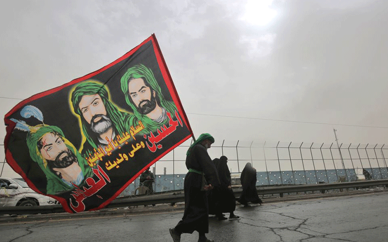 یک زائر اربعین حسینی با یک پرچم در راه کربلا