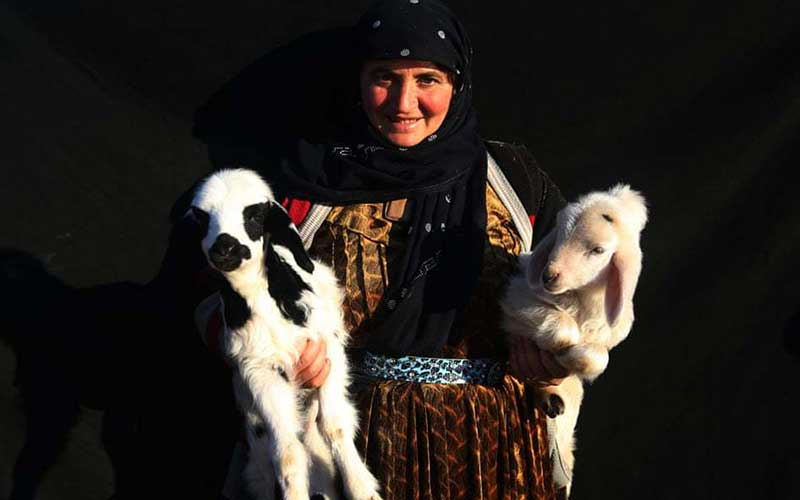 یک زن کشاورز ترکیه ای با دو گوسفند در آغوش